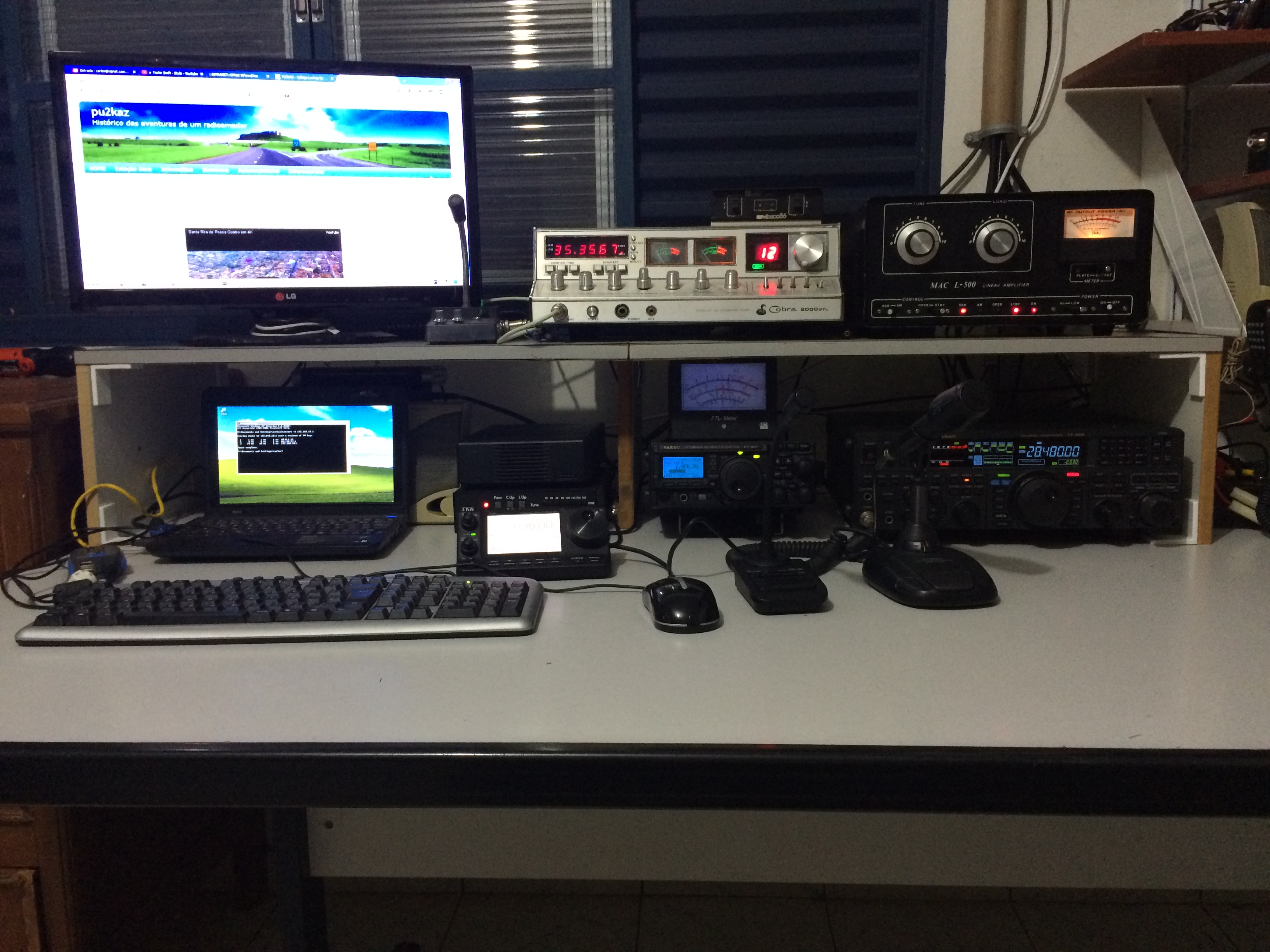 Layout 2015 Versão 1. Criado com resto de MDF a sobre prateleira proporcionou uma limpeza na mesa, ainda falta o background do negocio, os fios, apesar de já ter iniciado a melhoria ainda tem muito a fazer para que fique pratico para desligamento das antenas e de segurança contra descargas elétricas (eu que o diga!).